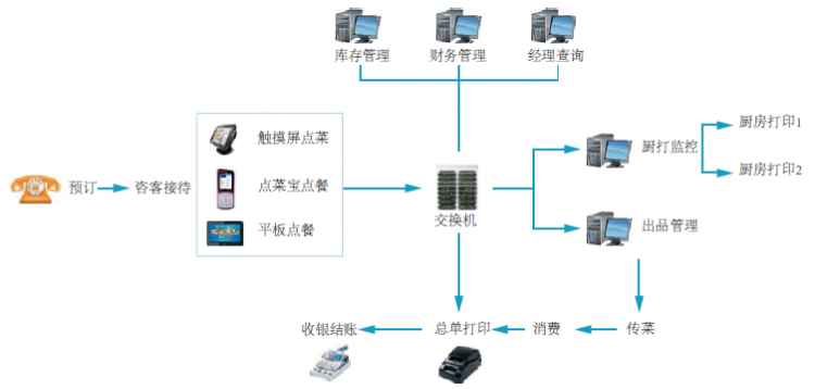 以处理预定、点菜、厨房传菜、前台打印、菜单维护、原料进销存、客户管理、菜品分析、成本分析、经营分析等餐饮管
